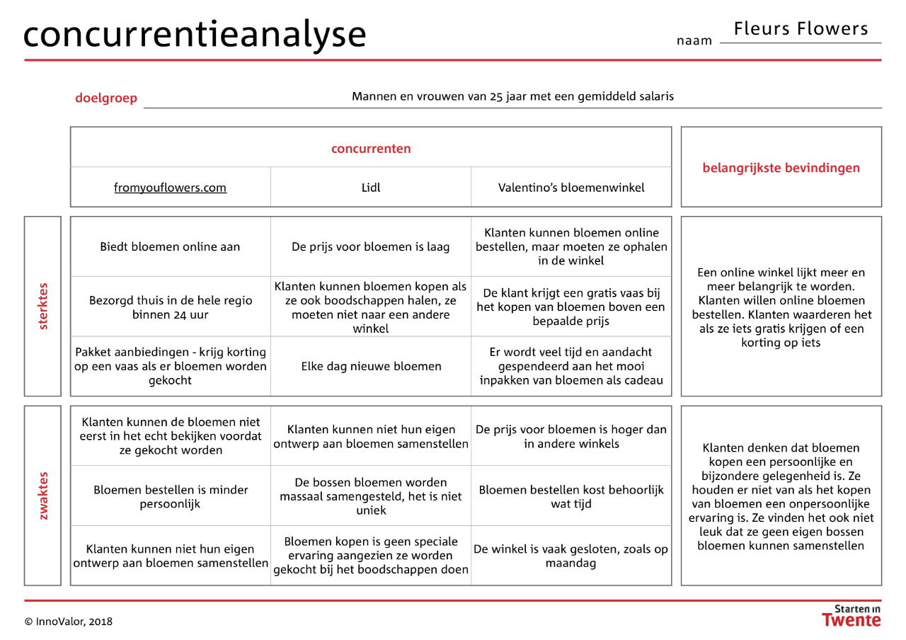 Bekijk het voorbeeld van Fleur Flowers om de Concurrentieanalyse beter te begrijpen en om de praktische toepassing van de tool te zien.