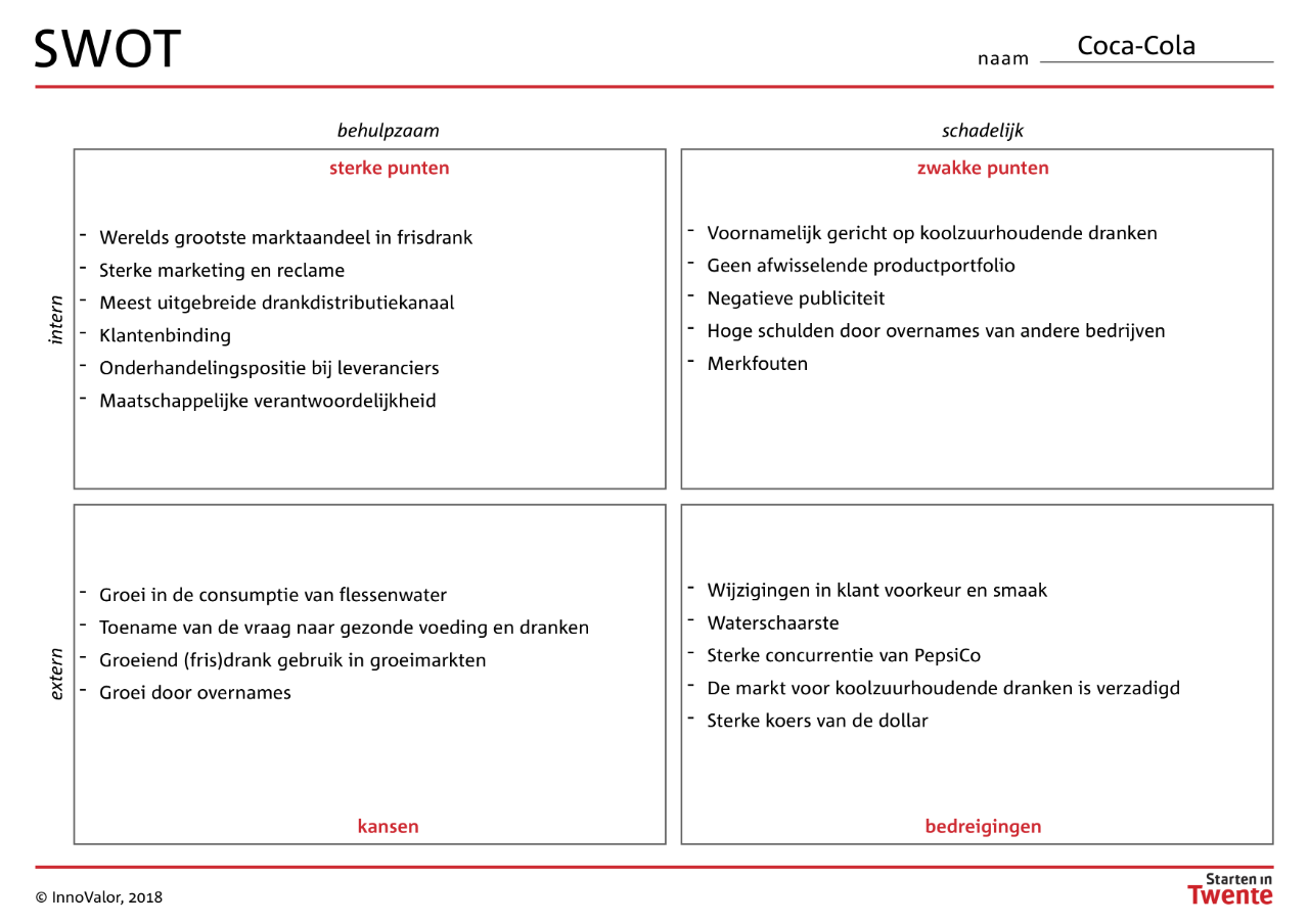 Print de template van SWOT groot uit. Download het voorbeeld van Coca-Cola en leer van de praktische toepassing van de SWOT.