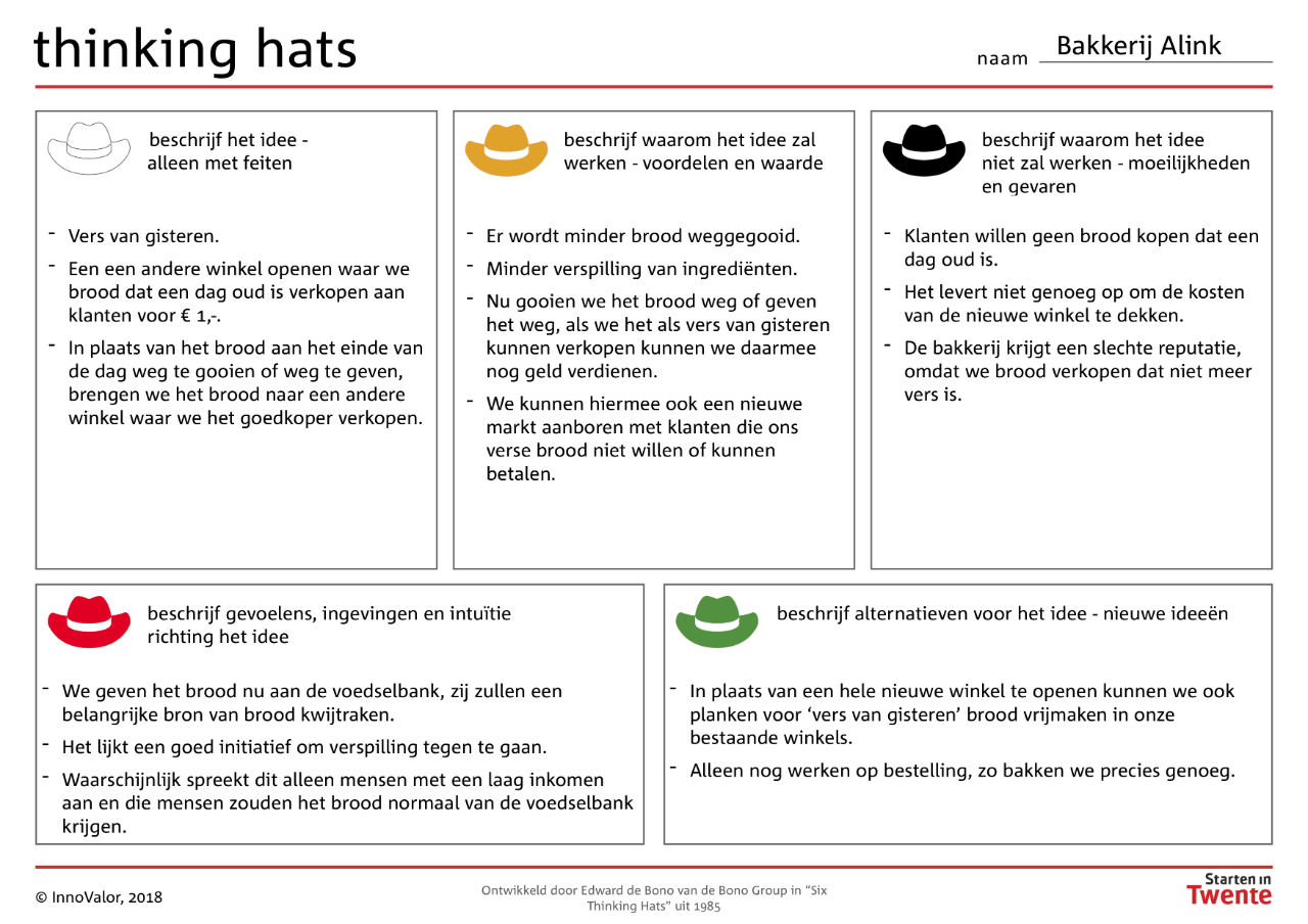 Print de template van de Thinking Hats groot uit en schrijf de belangrijkste punten en conclusies op. Laat je inspireren door het voorbeeld van Bakkerij Alink en leer van de praktische toepassing van de Thinking Hats.